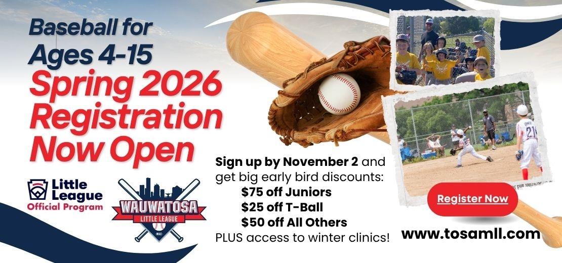 Click Here to RegisterEarly Bird Discounts: Register by November 2nd to receive discounts of $25 off Tee Ball, $50 off Machine Pitch, Minors, and Intermediate, and $75 off Juniors.